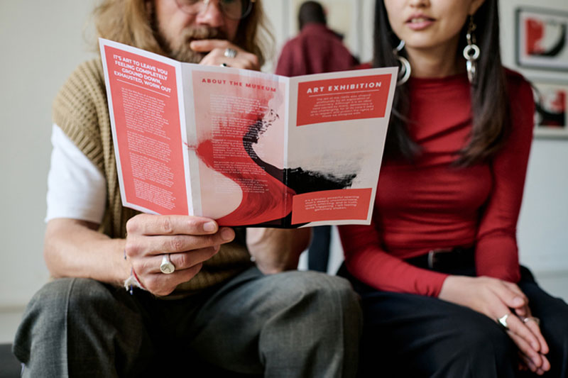 A slightly heavier cover stock can signal value. A soft-touch coating changes the feel of the piece. A spot gloss on a headline can quietly guide the eye.